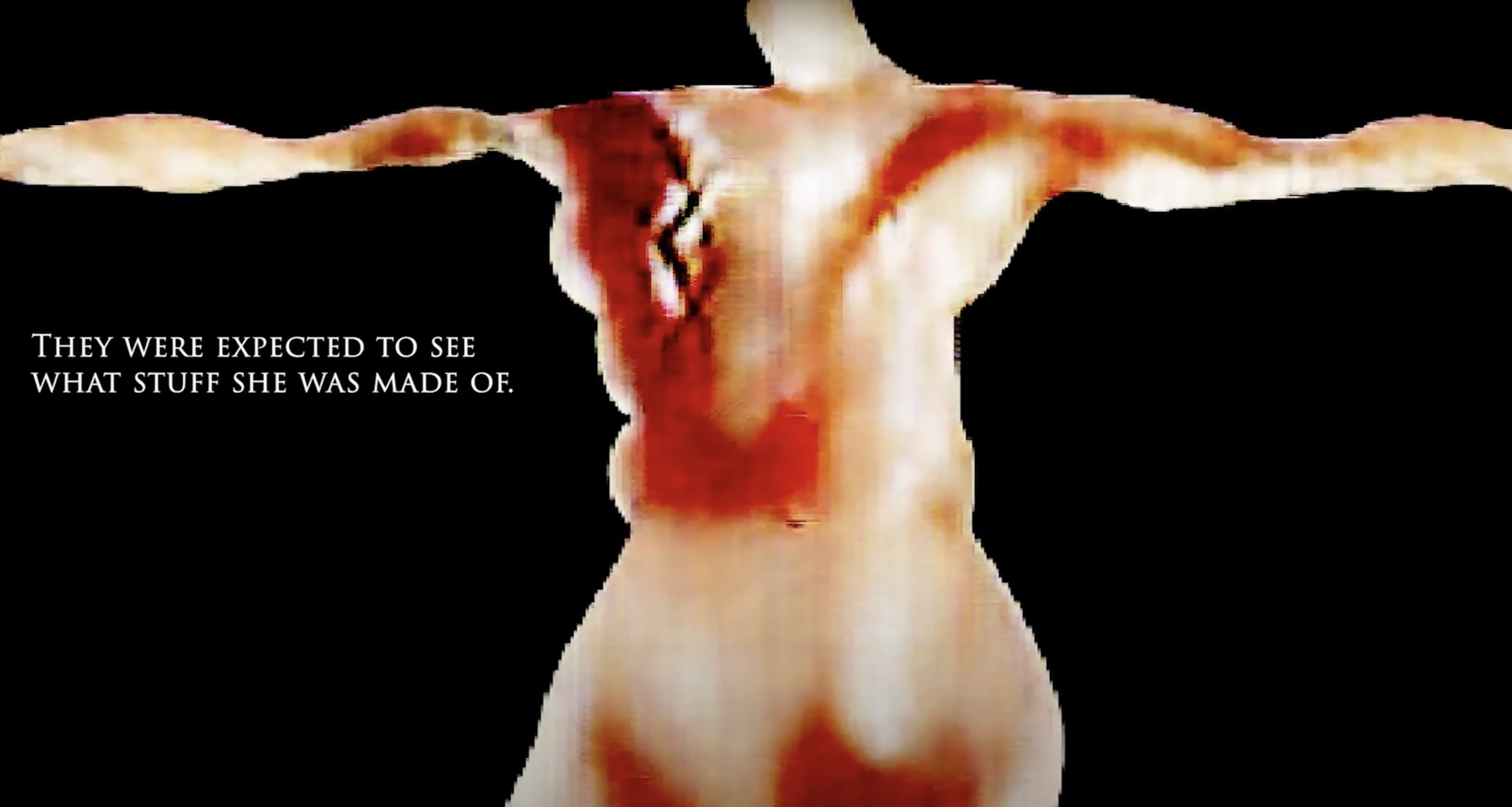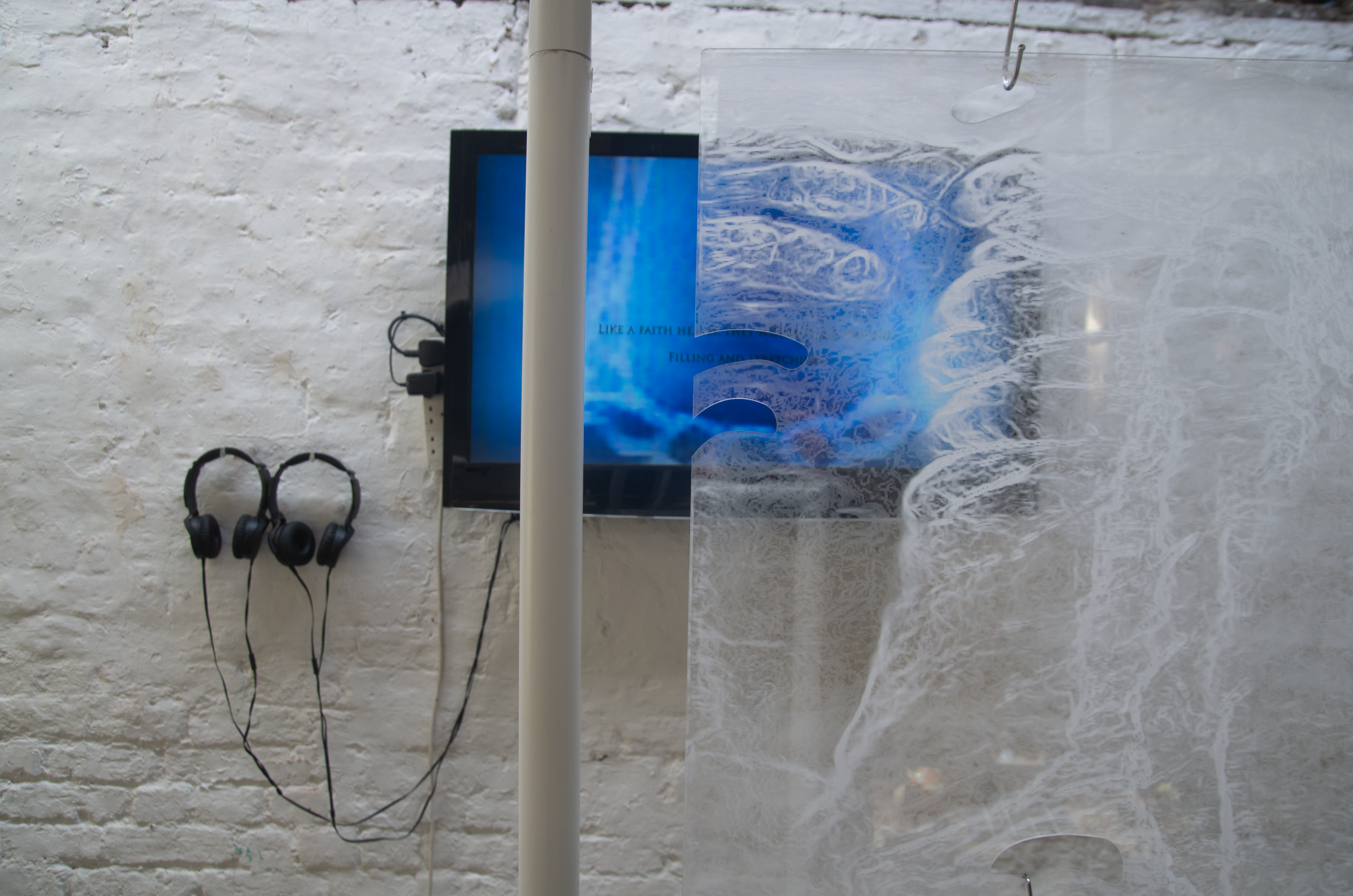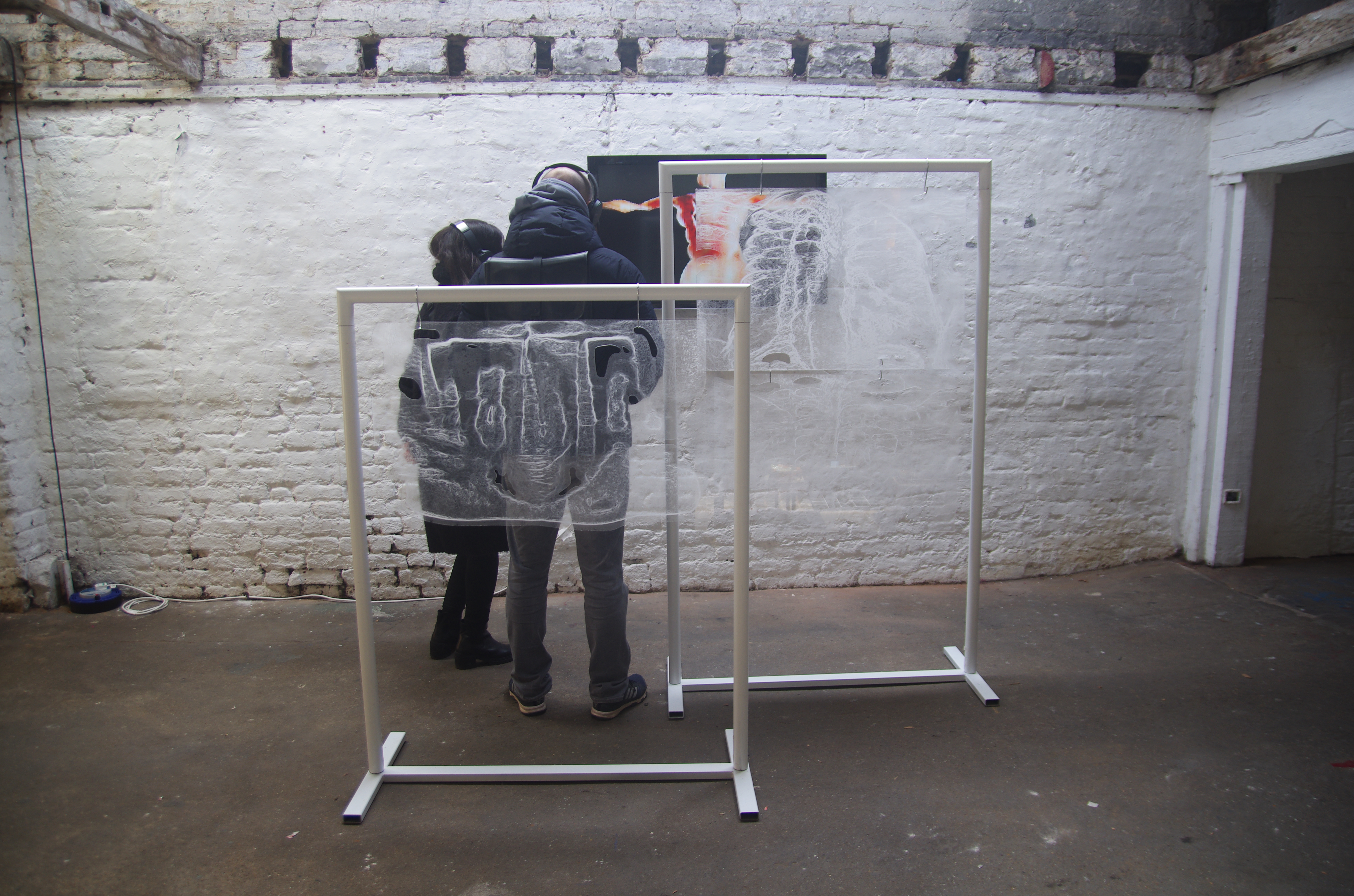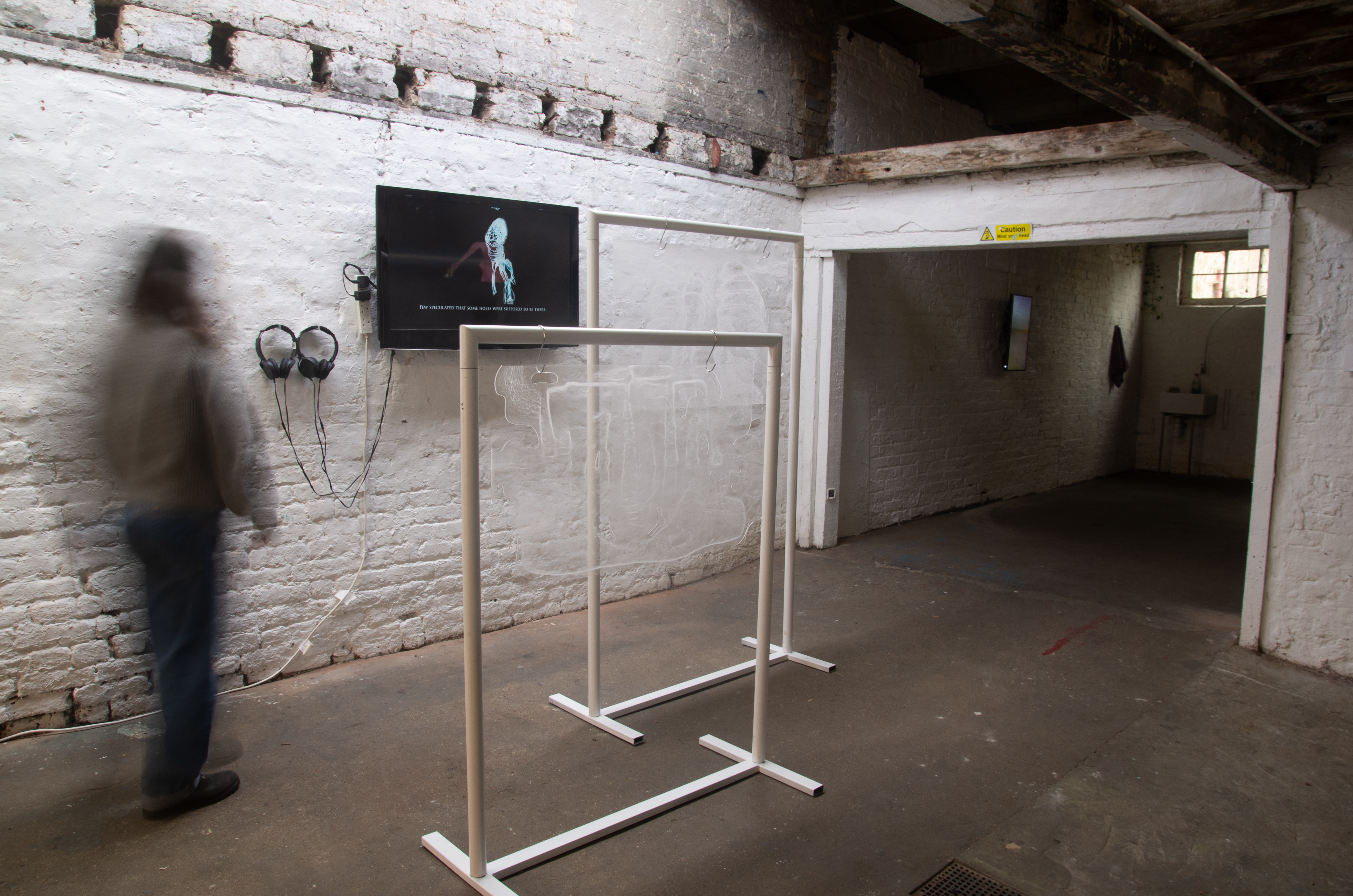 ‘They were expected to see what stuff she was made of’ is an audio visual installation. The focal point of the piece is a screen showing a film played on a loop. The video is overlaid with text, the tone and narrative of which draws on tropes of gothic literature, specifically themes of distrust in medical advancements and sinister scientists. The text questions the fidelity of medical imaging, specifically x-rays, PET scans and MRIs, and considers the impartiality and objectivity of the images these technologies produce and what impact the images subsequently have on the body figured via these procedures. Accompanying the screen are two free standing steel frames. Within the frames, three acrylic panels are hung with laser etched patterns that suggest anatomical illustration – one panel looks like a rib cage, another could be a pelvis or a block of flesh.
