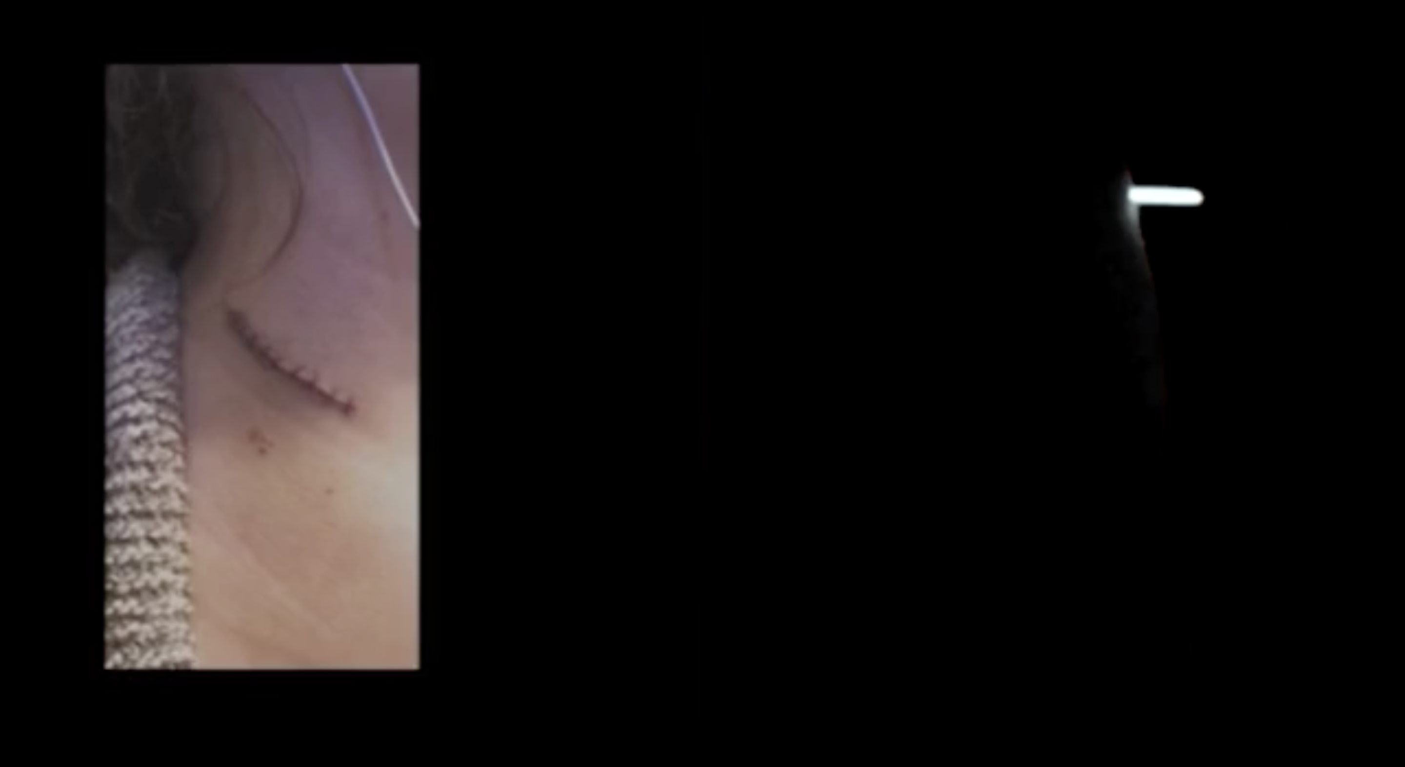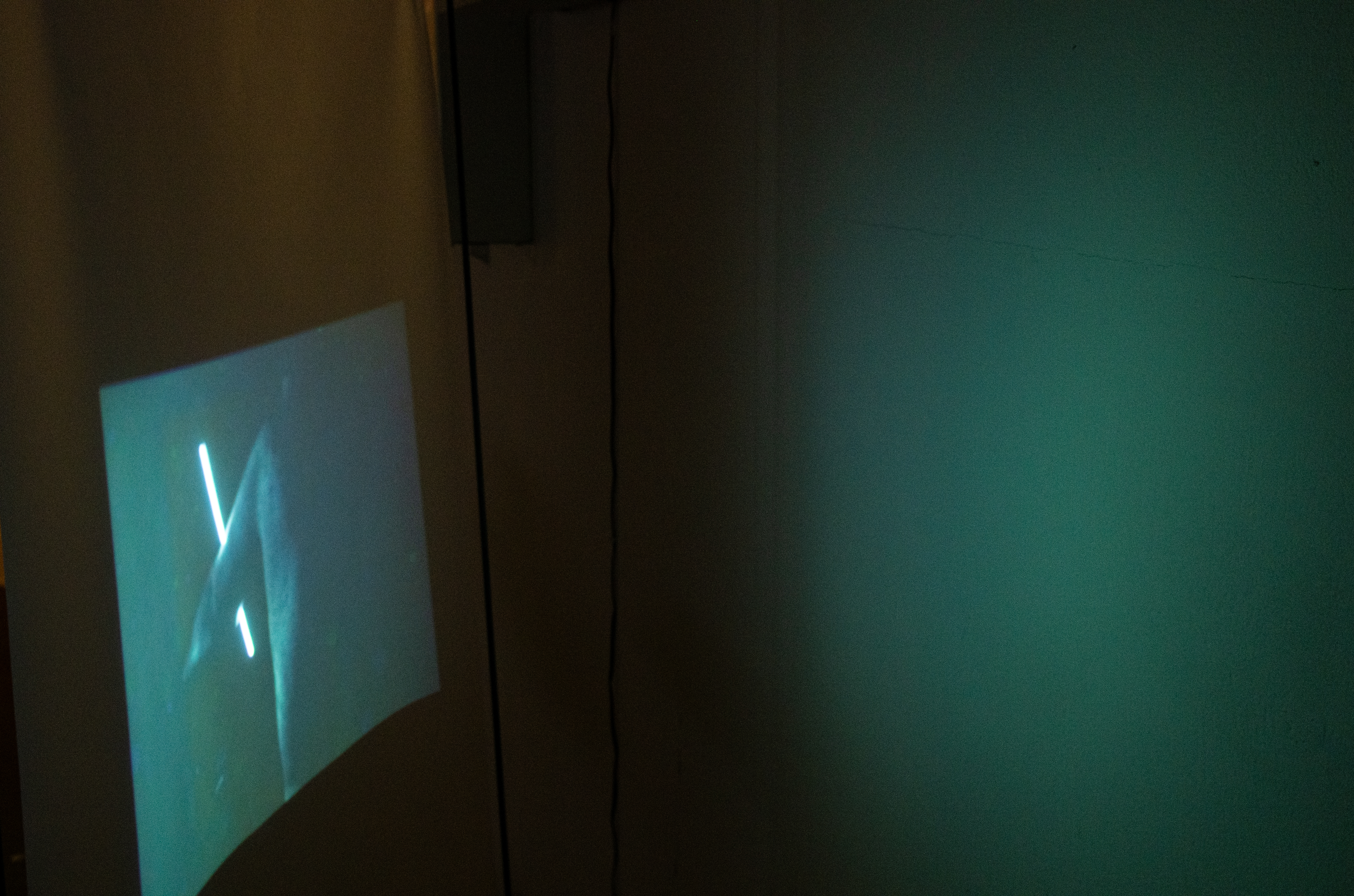 This installation consists of two split videos playing simulteanously, with a seperate soundtrack and spoken word poem ‘Feel your pulse’, is heard within the space. The work here is a meditation of self-checking and medical imaging, and was made very shortly after the artist had undergone an extended period of treatment following a diagnoses with Hodgkins Lymphoma. The work here is a direct response to that experience, and the confusing relationship to the body that is created through medical imaging, and a mix of too much and too little information about your own physiology. The video includes close up photographs of scars, footage of the artist scanning herself with a hand held scanner, the results of those scans. These images are flash on and off screen, along with bright boxes of light which when projected, mimic the light from the recycled nhs x-ray display box mounted on one wall. The spoken word poetry intoned at intervals in the space acts sounds concerned and kindly, and oppressive, asking questions like, “is your head hot? have you had enough water?” and giving out a stream of instructions like “cut out sugar, cut out salt, cut out alcohol, give up caffine after 6, give up screens after 6…”.