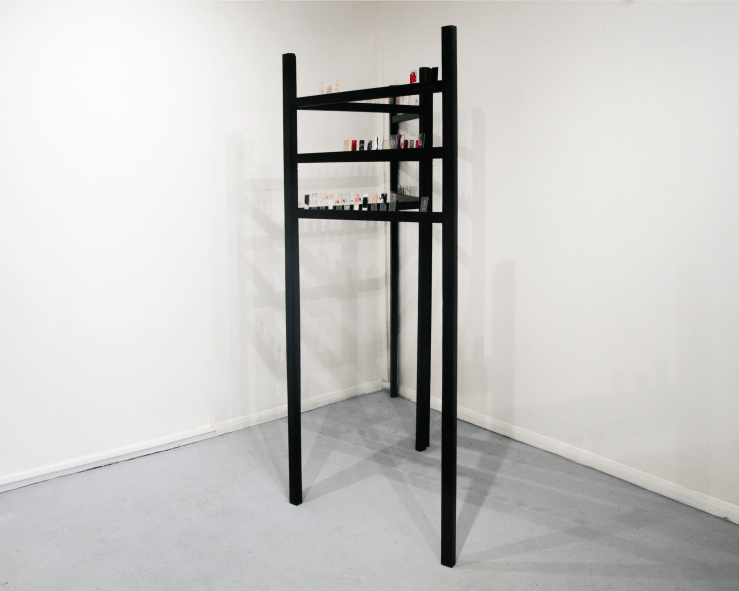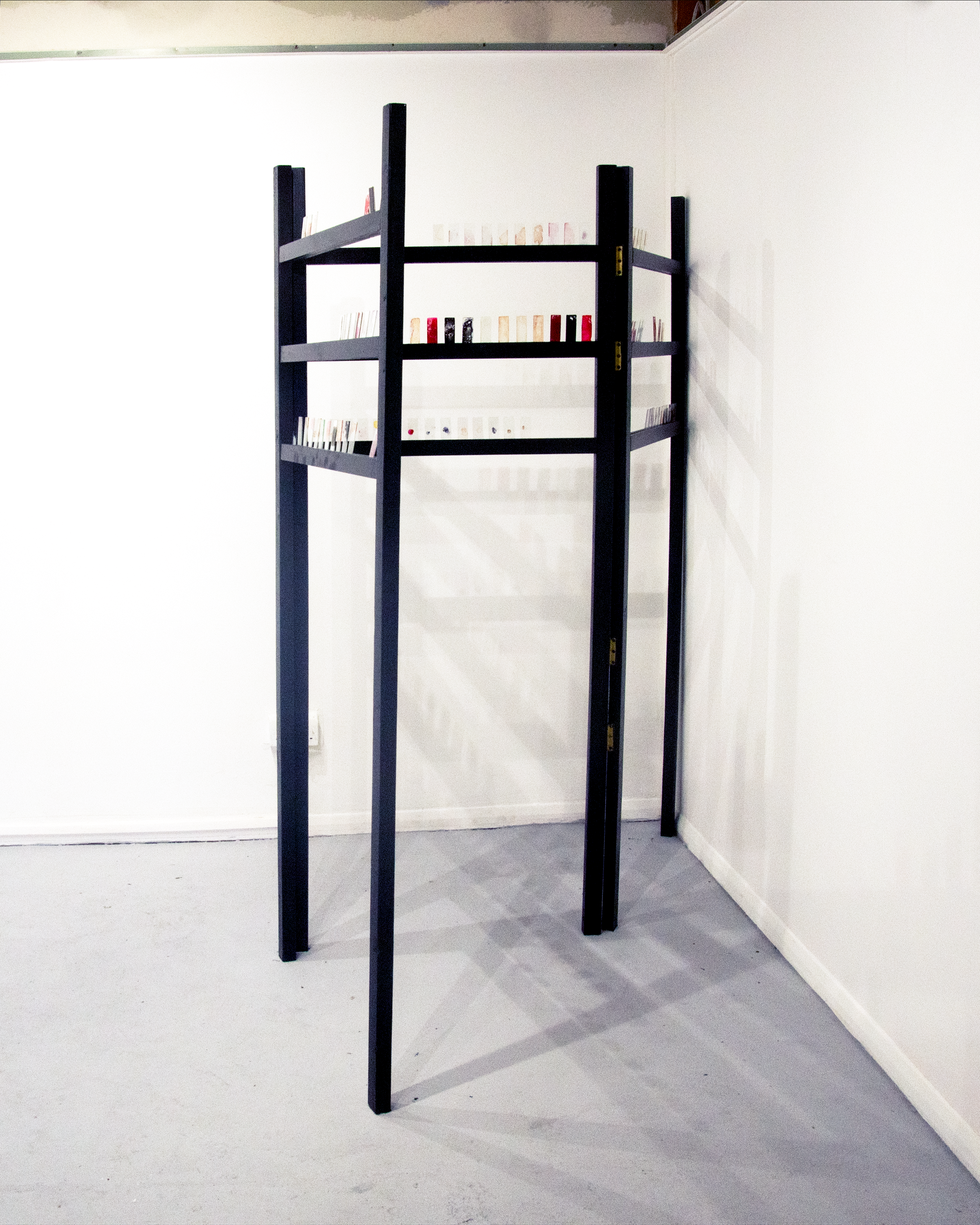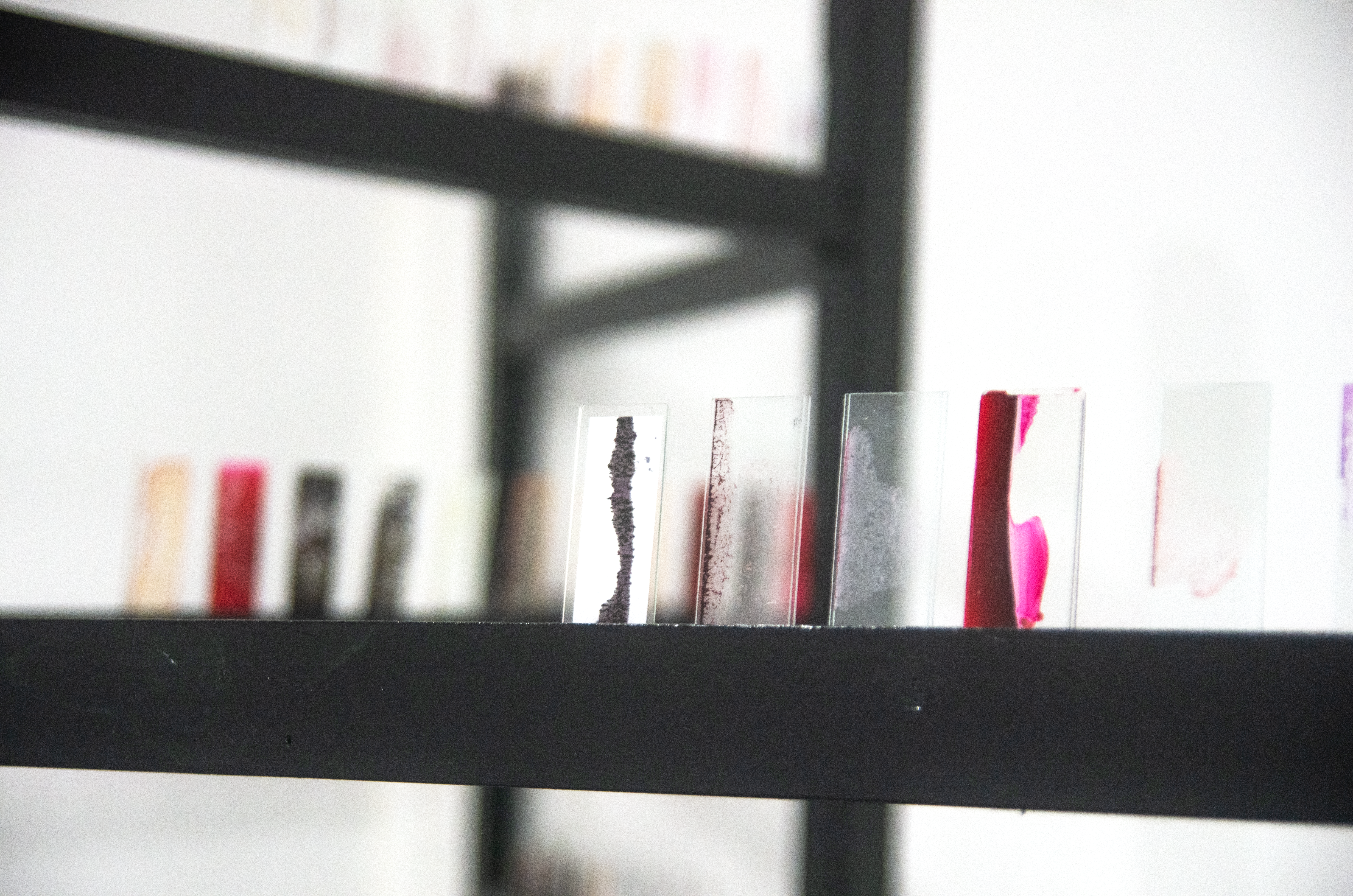 The piece is a material exploration on the examination of bodily fluids, and artificial bodily fluids as a form of self checking. Tindle was influenced by medical sample cabinets, Victorian apothecaries as they appear in fiction and the history of the space, which had previously functioned as a cornoner’s office.