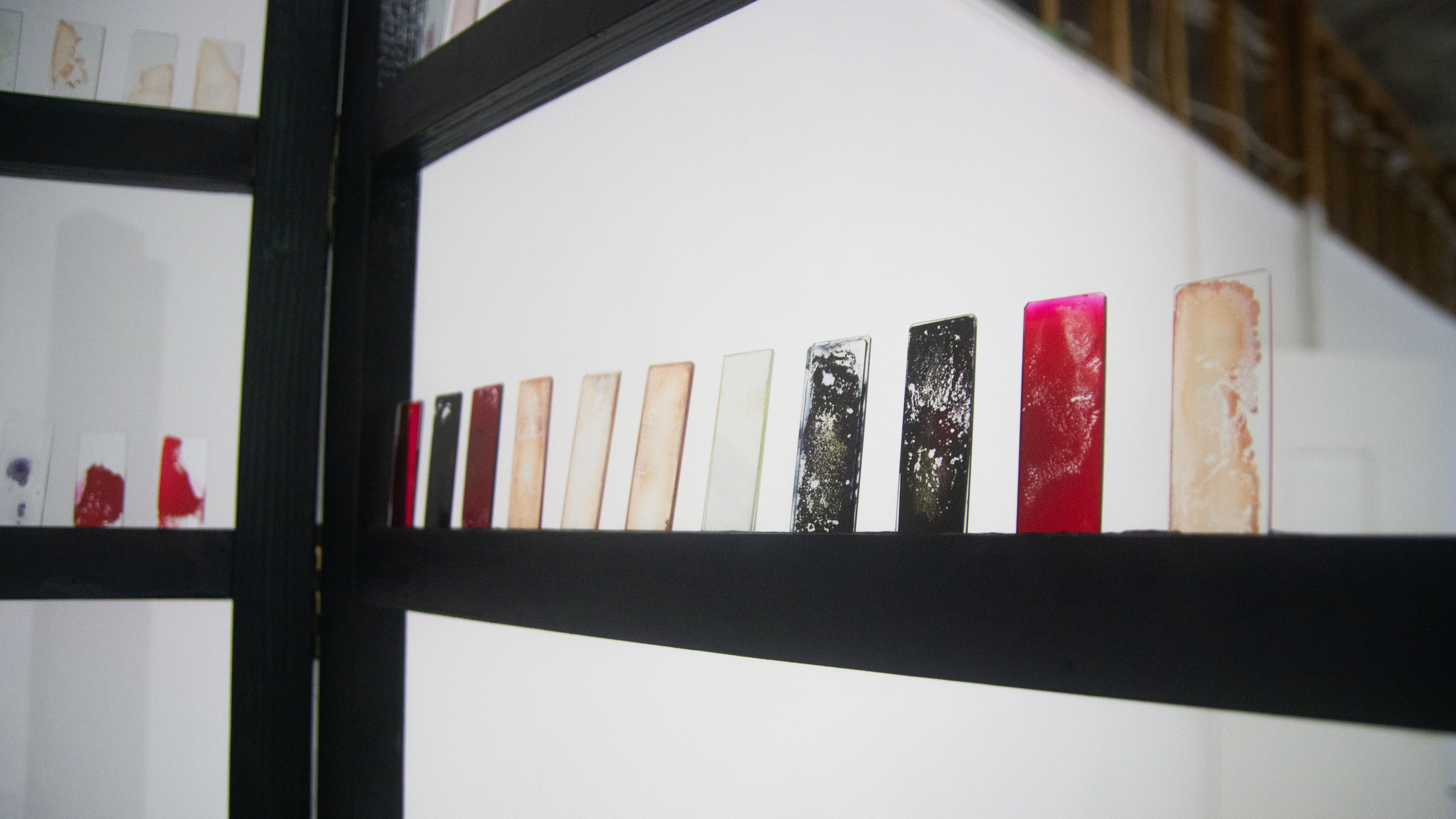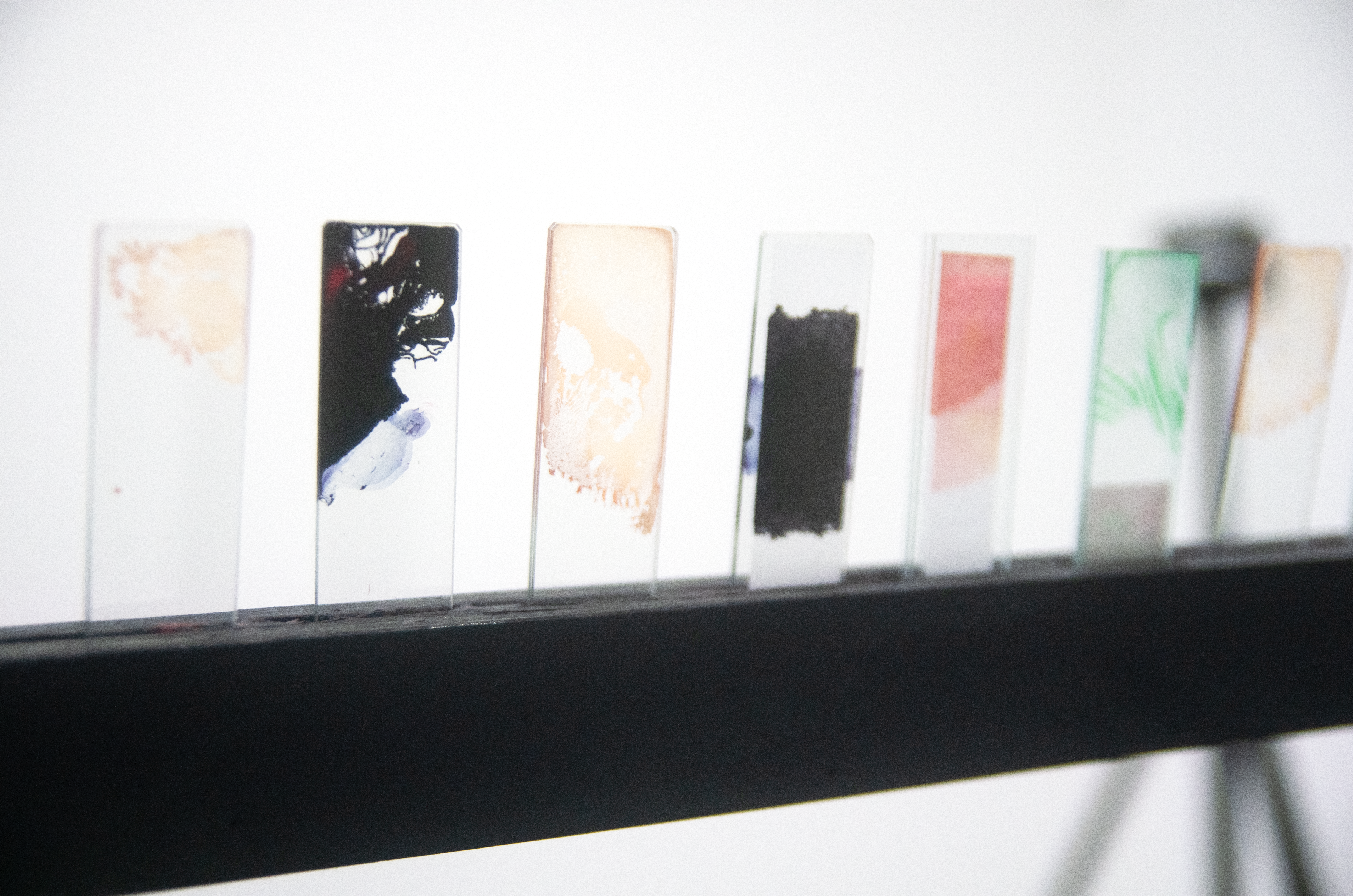 Wood, glass microscope slides, ink, paper, paint, blood, fake blood