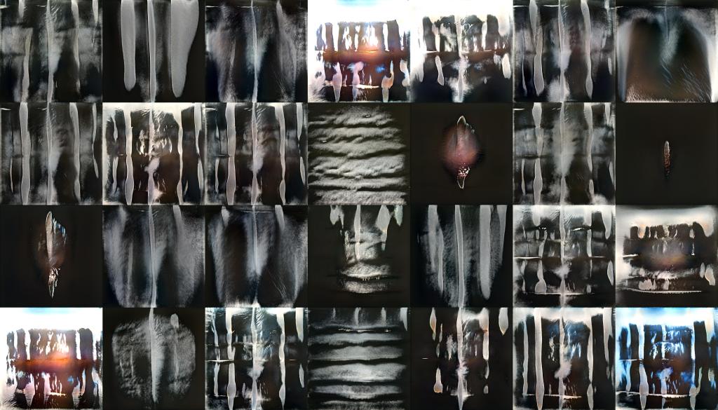 StyleGan2 is a Generative Adversarial Network which is capable of generating large quantities of high-quality images. To create the ‘realistic’ x-ray images featured in my video piece, and on the laser etched panels, I trained StyleGan2 on a set of X-rays I scraped from Google images. I used this relatively small and varied data set rather than a large medical data set as this would eventually generate weirder, more uncanny results. The majority of my time here was spent adjusting the parameters of the training and observing the training outputs.