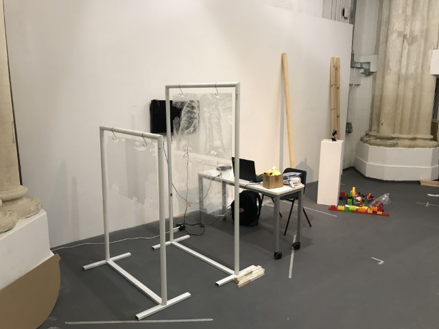 The video piece at the centre of the installation describes a fictionalised set of medical procedures. The film tells the story of an unknown woman who is undergoing an examination to see whether she has an illness which is not yet fully understood. The illness is causing holes and gaps to appear in the sufferers’ insides, progressing to the point where the body crumbles. Scientists are unsure of what causes the disease, whether it be environmental, moral, spiritual or caused by the procedure itself. Treatment is also debated and the full effects of the illness are not understood. This writing is the scaffolding around which the rest of the work is built, and functions as a way for me to critique the concept of a homogenous body, the language of illness and idea there can be universal truths on which to base treatment of the body. This piece acknowledges that medicine involves interpretation and to understand it to be absolute ignores the situatedness of healthcare as a practice. This denial of subjectivity in turn can work to marginalise those who have bodies which are not what is currently understood as average.