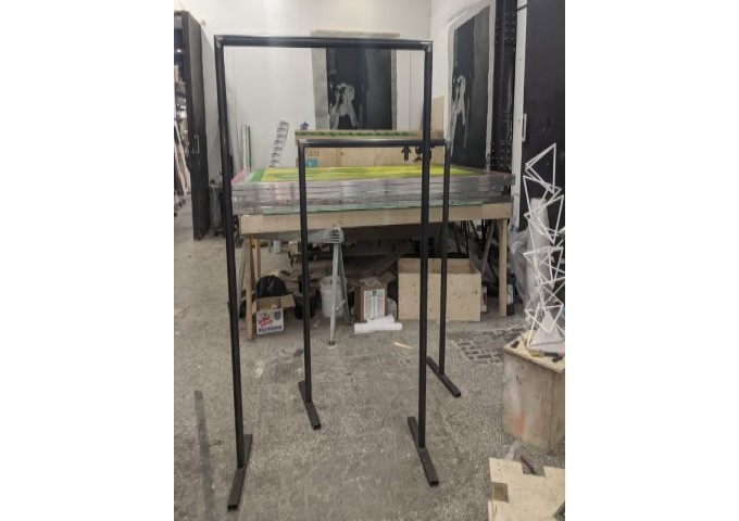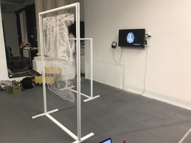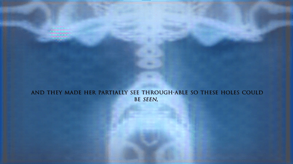 ‘They were expected to see what stuff she was made of’ is an audio visual installation. The focal point of the piece is a screen showing a film played on a loop. The video is overlaid with text, the tone and narrative of which draws on tropes of gothic literature, specifically themes of distrust in medical advancements and sinister scientists. The text questions the fidelity of medical imaging, specifically x-rays, PET scans and MRIs, and considers the impartiality and objectivity of the images these technologies produce and what impact the images subsequently have on the body figured via these procedures. Accompanying the screen are two free standing steel frames. Within the frames, three acrylic panels are hung with laser etched patterns that suggest anatomical illustration – one panel looks like a rib cage, another could be a pelvis or a block of flesh.